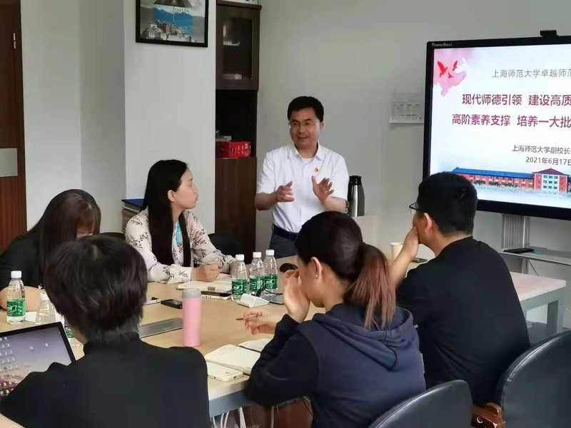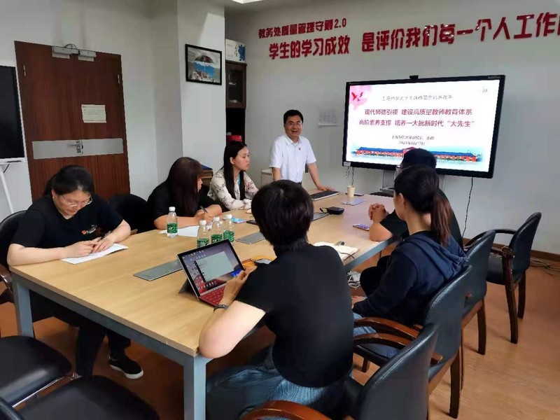 2021年6月17日下午,教务处党支部组织全体党员与全处其他同志一起,在行政楼204会议室开展党课学习活动,党课由储继峰书记主持。李晔副校长以“现代师德引领,建设高质量教师教育体系;高阶素养支撑,培养一大批新时代大先生”为主题,给教务处全体与会人员上了一堂别开生面的党课。