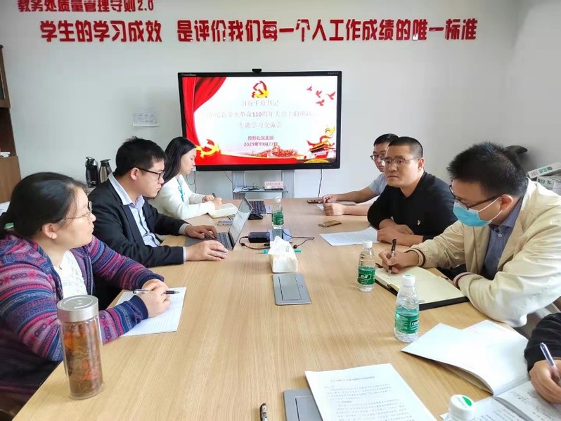 10月9日,习近平总书记在纪念辛亥革命110周年的大会上发表了重要讲话,这也是教务处党支部10月份主题党日活动专题学习的主要内容,本次党日活动以线上线下混合方式举行,线下活动在行政楼204会议室举行,由储继峰书记主持。