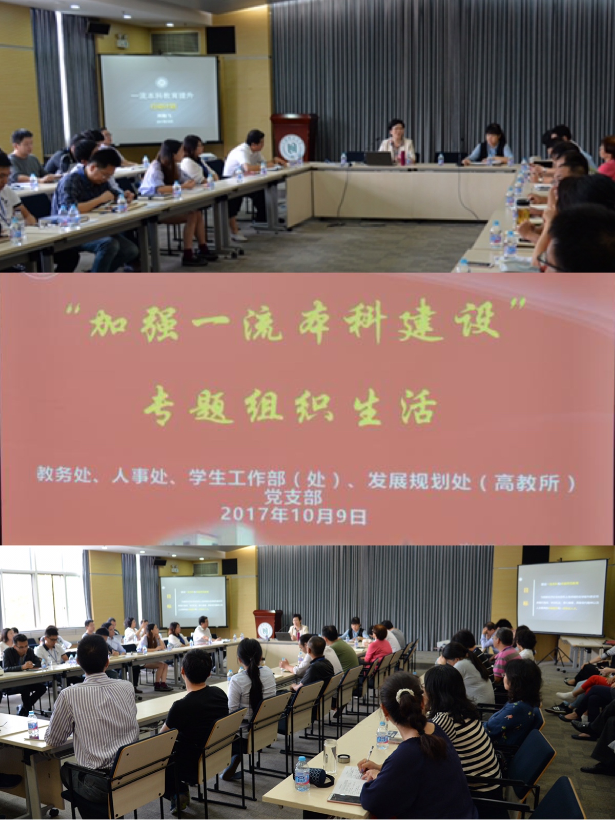10月9日下午,教务处、人事处、学工部(处)、发展规划处(高教所)4个党支部联合开展组织生活,邀请副校长柯勤飞作关于“加强一流本科建设”的专题报告。