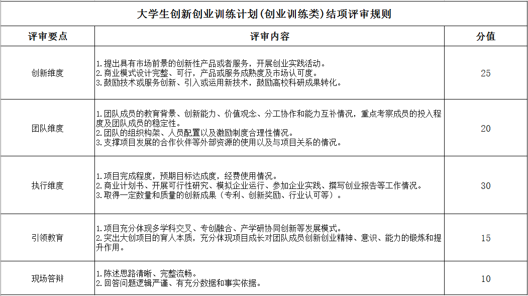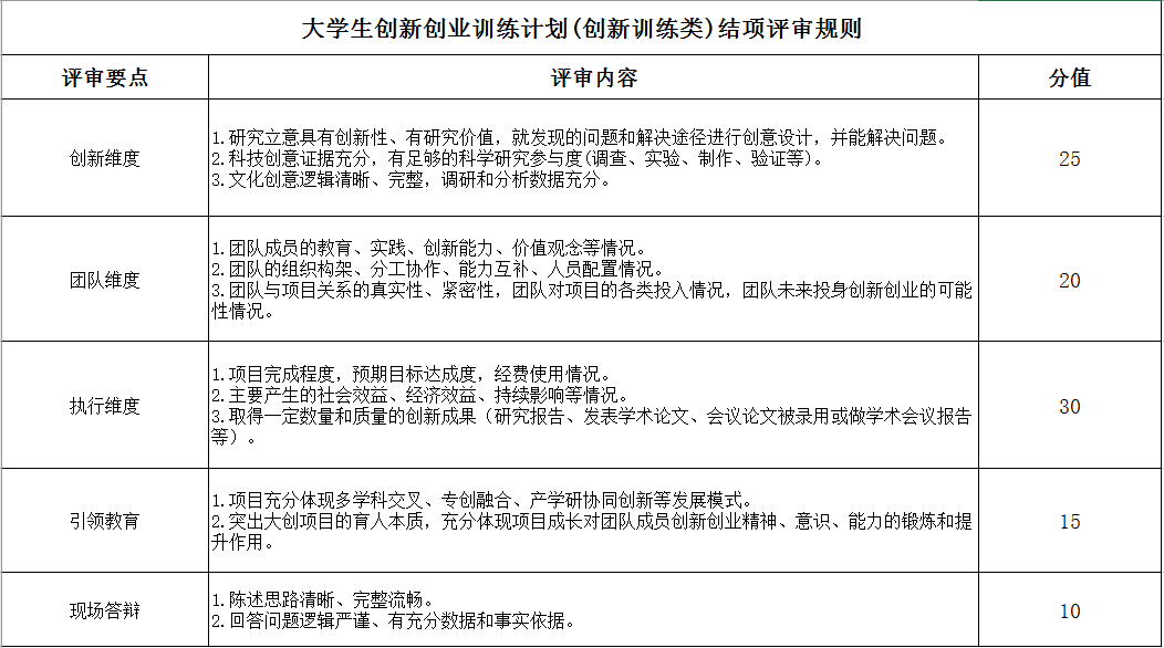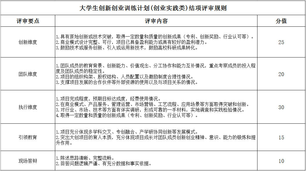 学校鼓励学生通过大创项目产出论文、专利(软件著作权)、专著等成果。学生以第一作者发表论文和出版专著,参与获得专利(著作权)在结题评审环节中可附加分。同组多个成员参与的同一个成果记1次、每个项目加分最多累计10分。各类成果具体加分分值如下:
